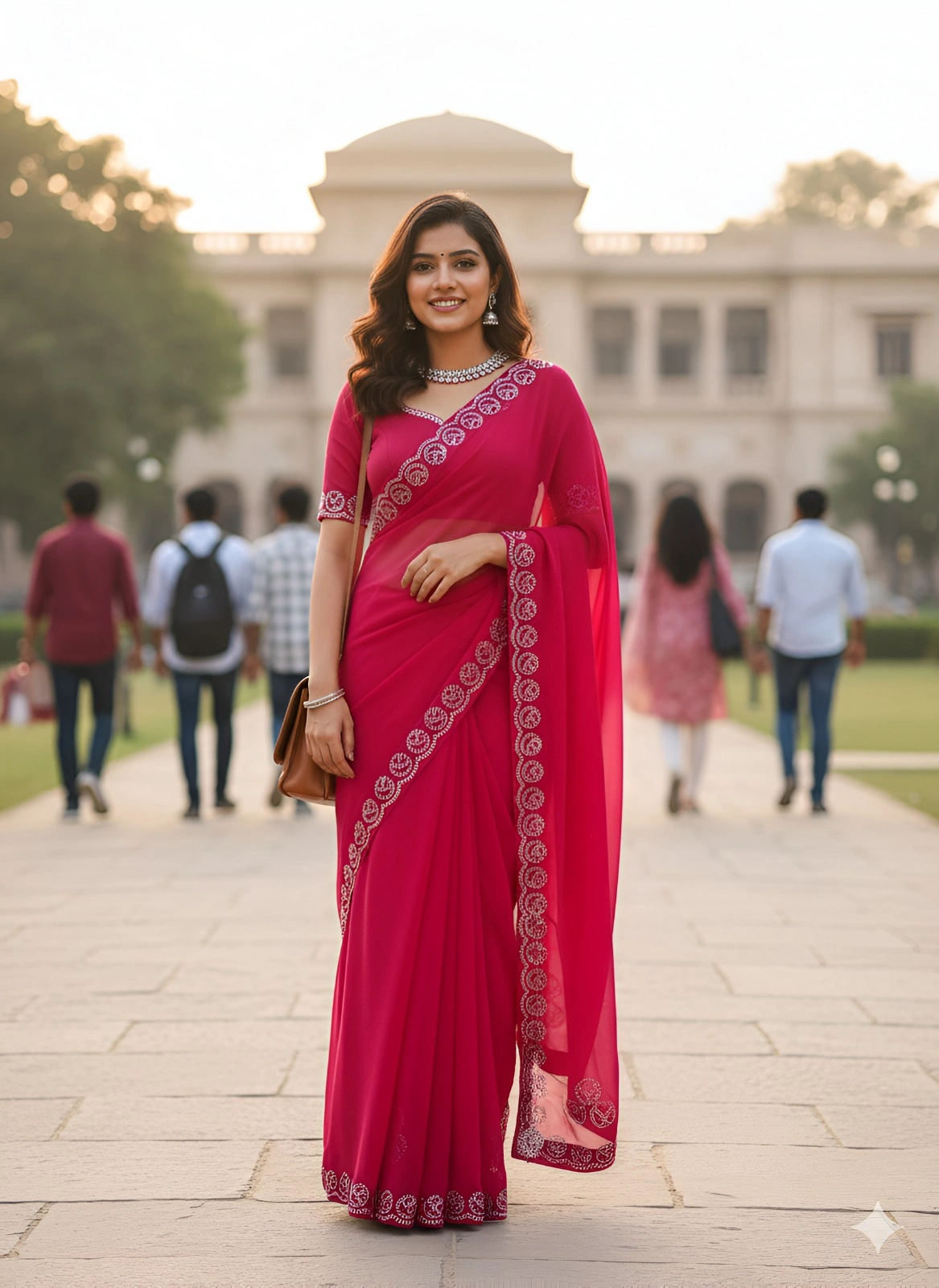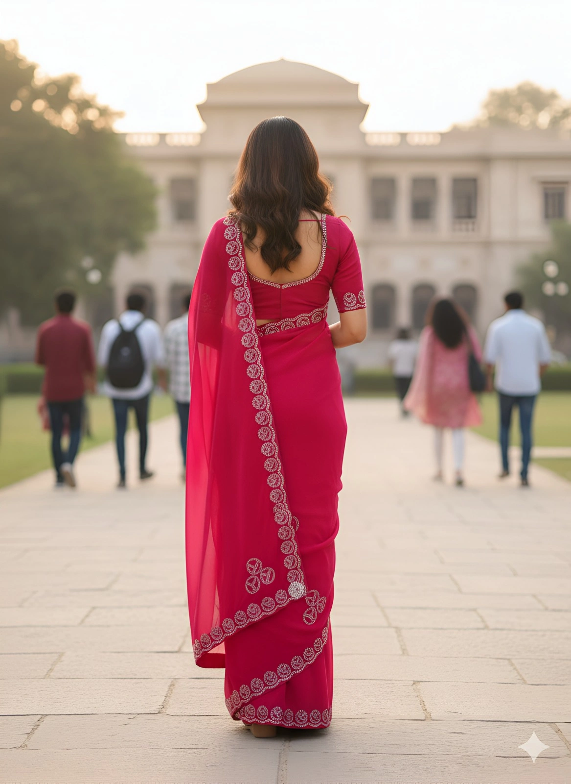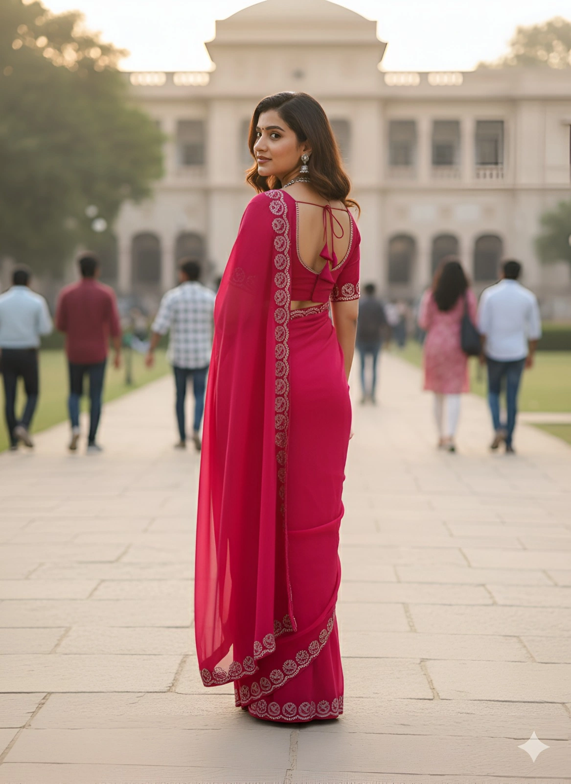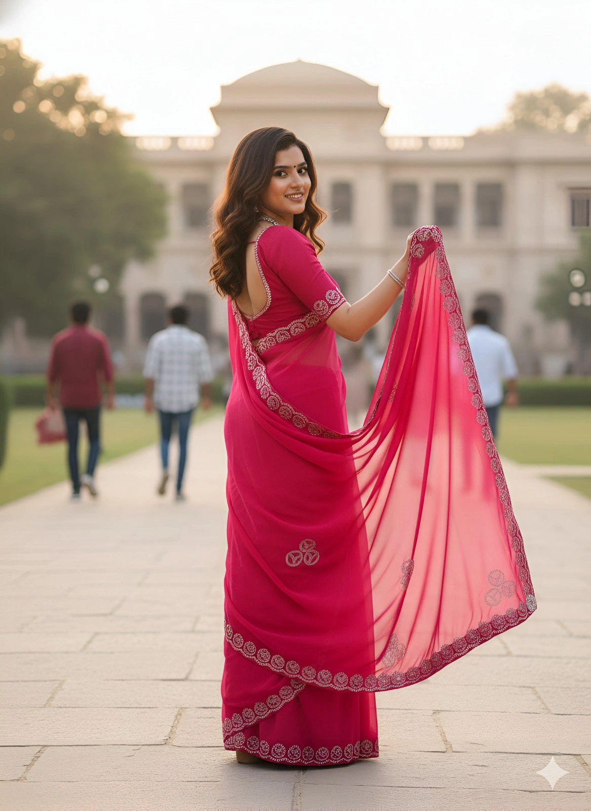 This elegant magenta chiffon saree features exquisite silver gota-patti embroidery with traditional paisley motifs, captured beautifully against heritage architecture. The lightweight fabric offers perfect drape and flow as shown in the photos.