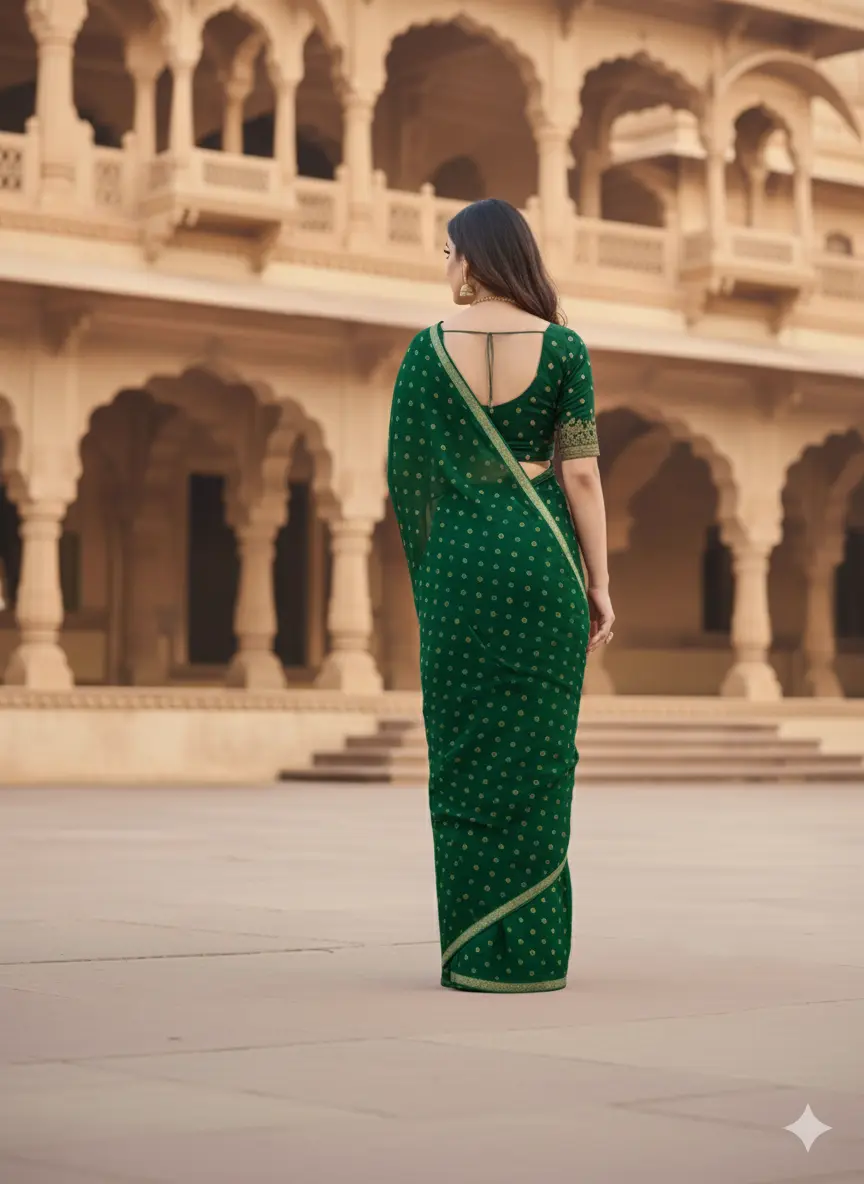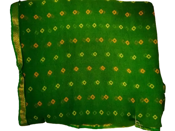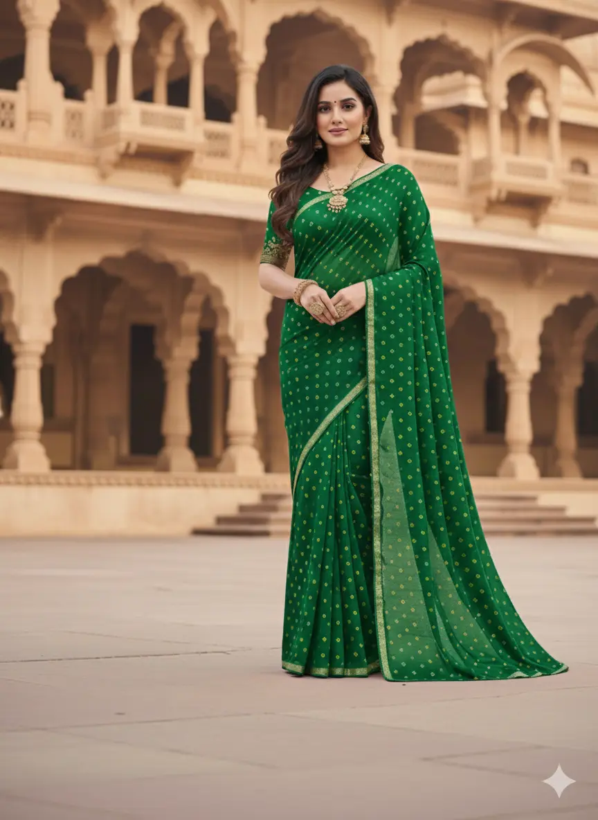 This captivating emerald green Bandhani saree embodies the essence of traditional Indian craftsmanship, crafted from lightweight and breathable fabric that offers a graceful drape. The saree features a delicate diamond pattern in shades of yellow and green, creating a vibrant yet elegant look perfect for festive and special occasions. The golden border adds a touch of sophistication, enhancing its appeal for weddings or cultural events. Paired with a matching green blouse with intricate detailing, this saree combines comfort and style, making it a stunning addition to any wardrobe.