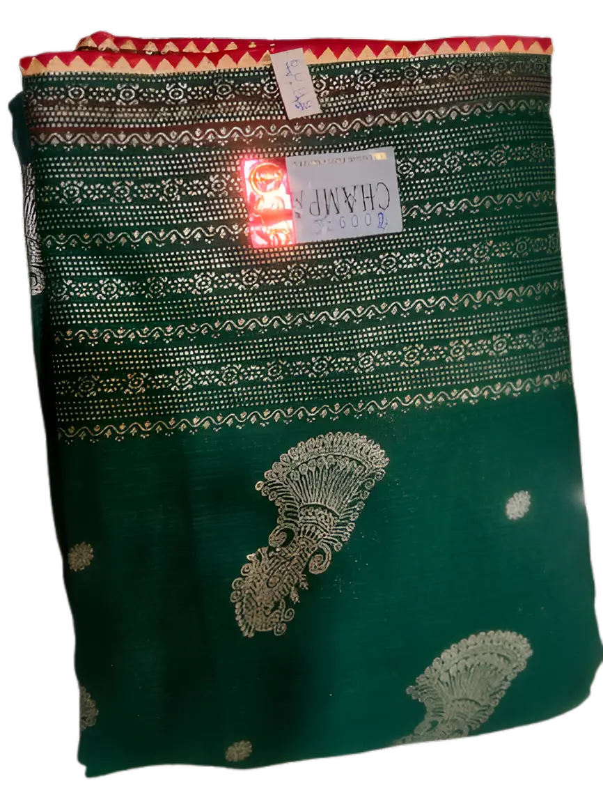 This stunning green saree is a perfect blend of traditional elegance and modern style. Crafted from high-quality fabric, it features intricate gold embroidery with elegant paisley motifs and delicate border detailing. The saree comes with a matching blouse piece, making it ideal for festive occasions, weddings, or any special event. The rich green color paired with gold accents adds a touch of sophistication, while the lightweight material ensures comfort throughout the day. Perfect for the fashion-forward woman who loves to make a statement with her attire.