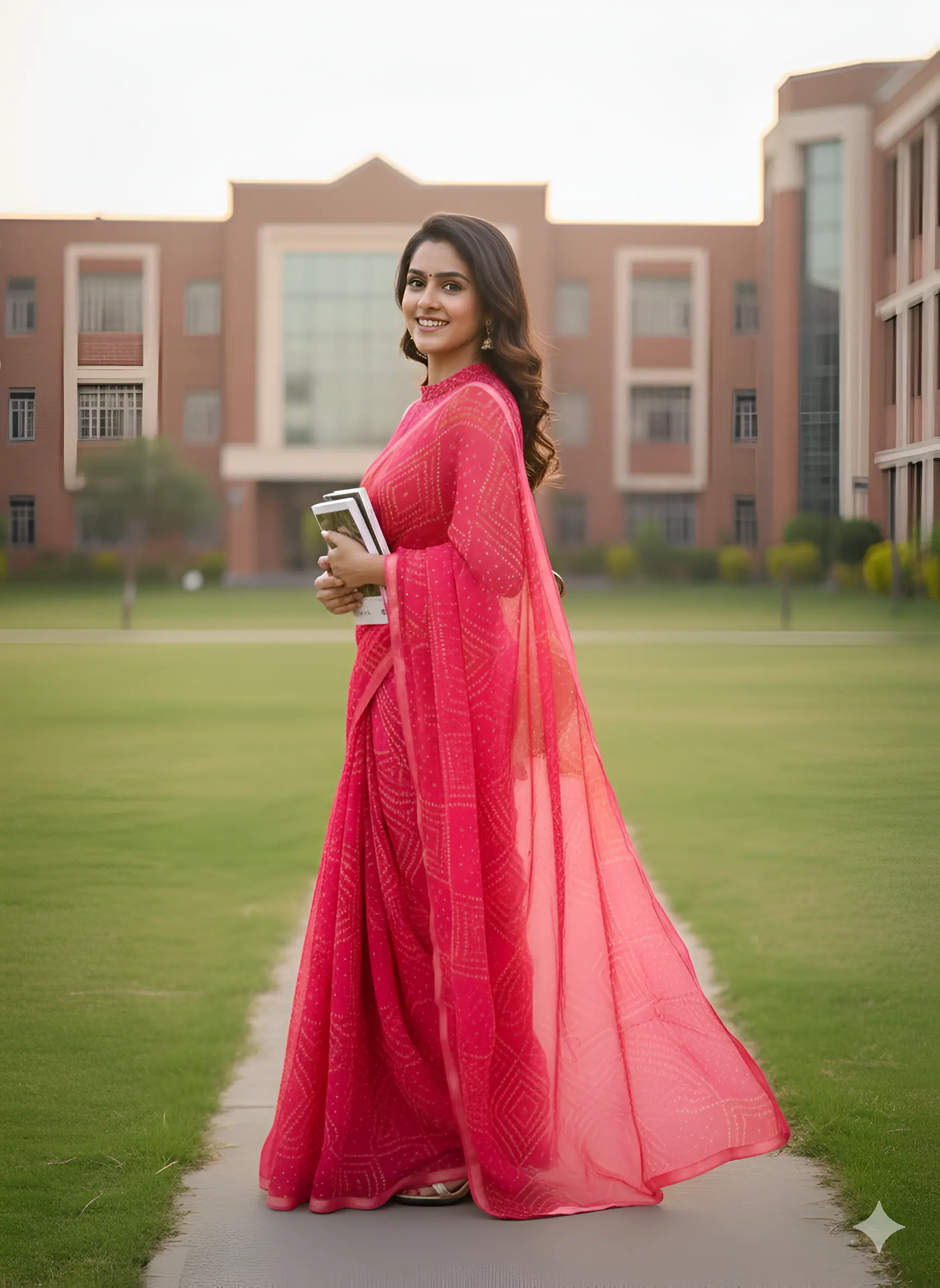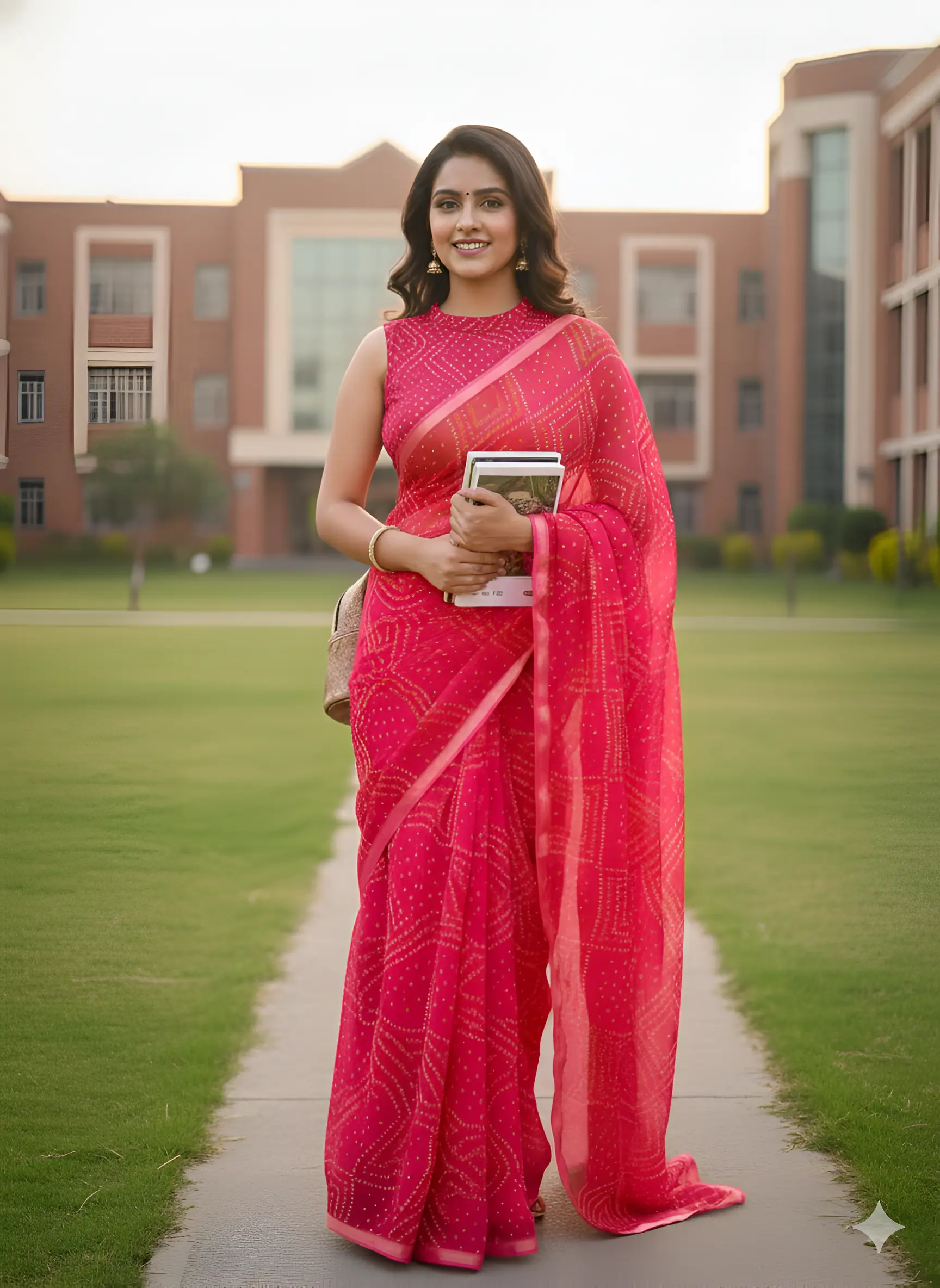 A stunning pink saree featuring intricate patterns, ideal for festive and formal occasions. Crafted with lightweight fabric, it offers comfort and style.