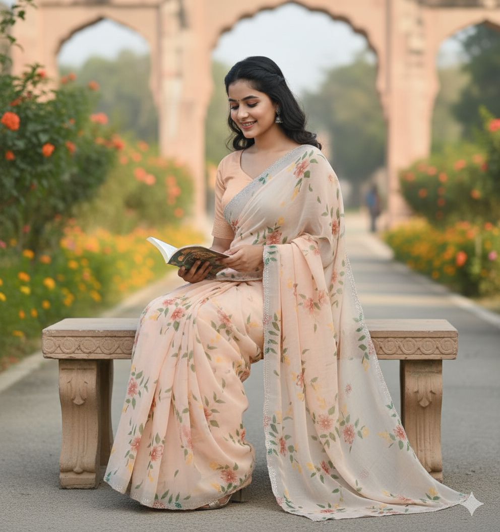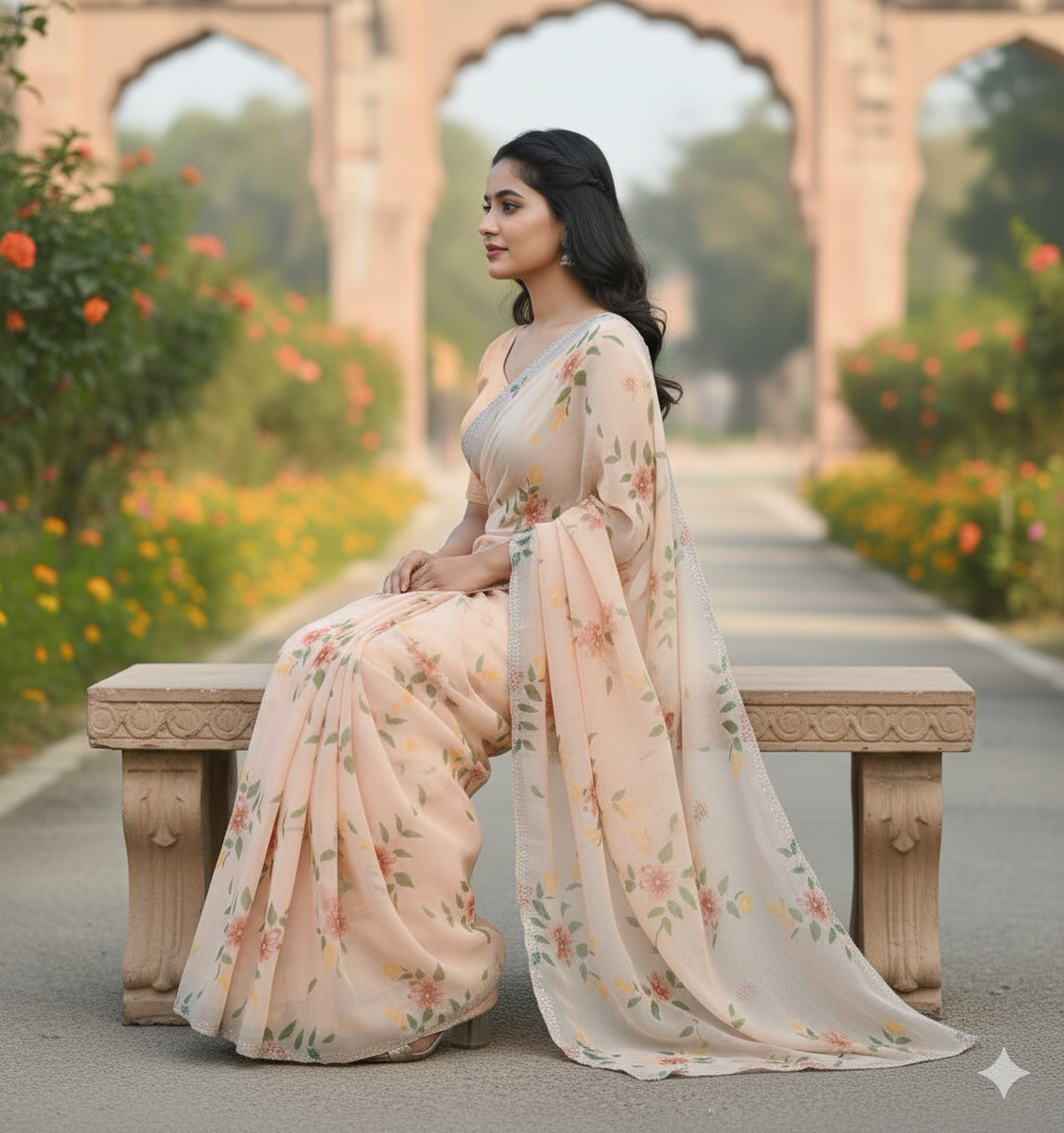 This floral silk saree blends traditional Indian artistry in a soft peach shade, inspired historic arches and gardens – exactly like the beauty shown in the photos.