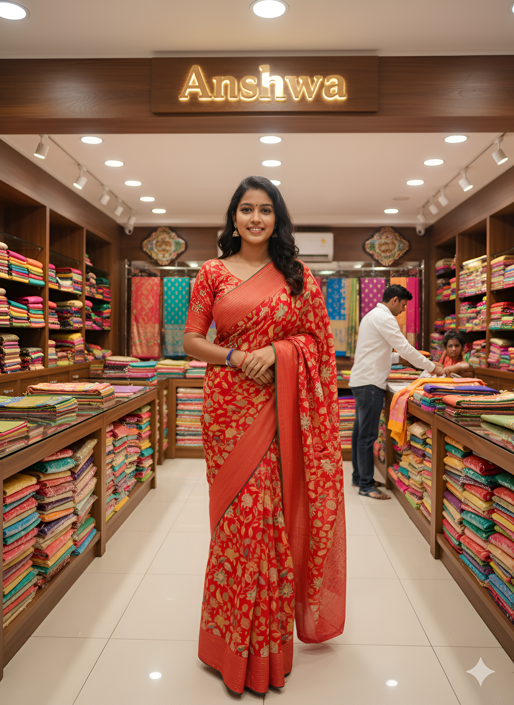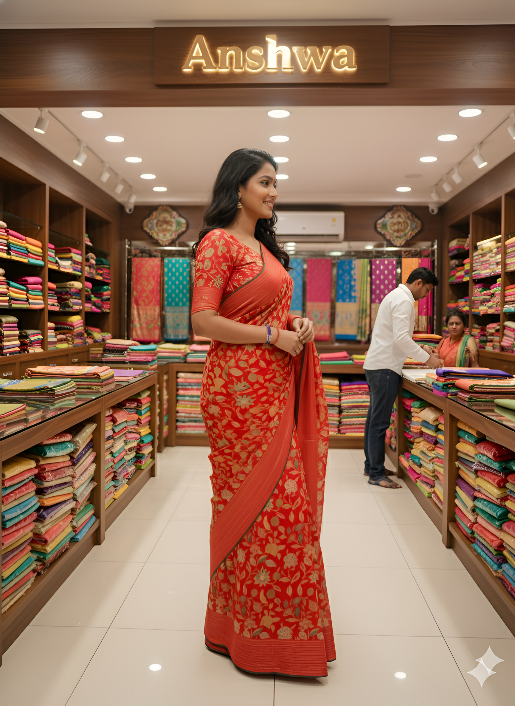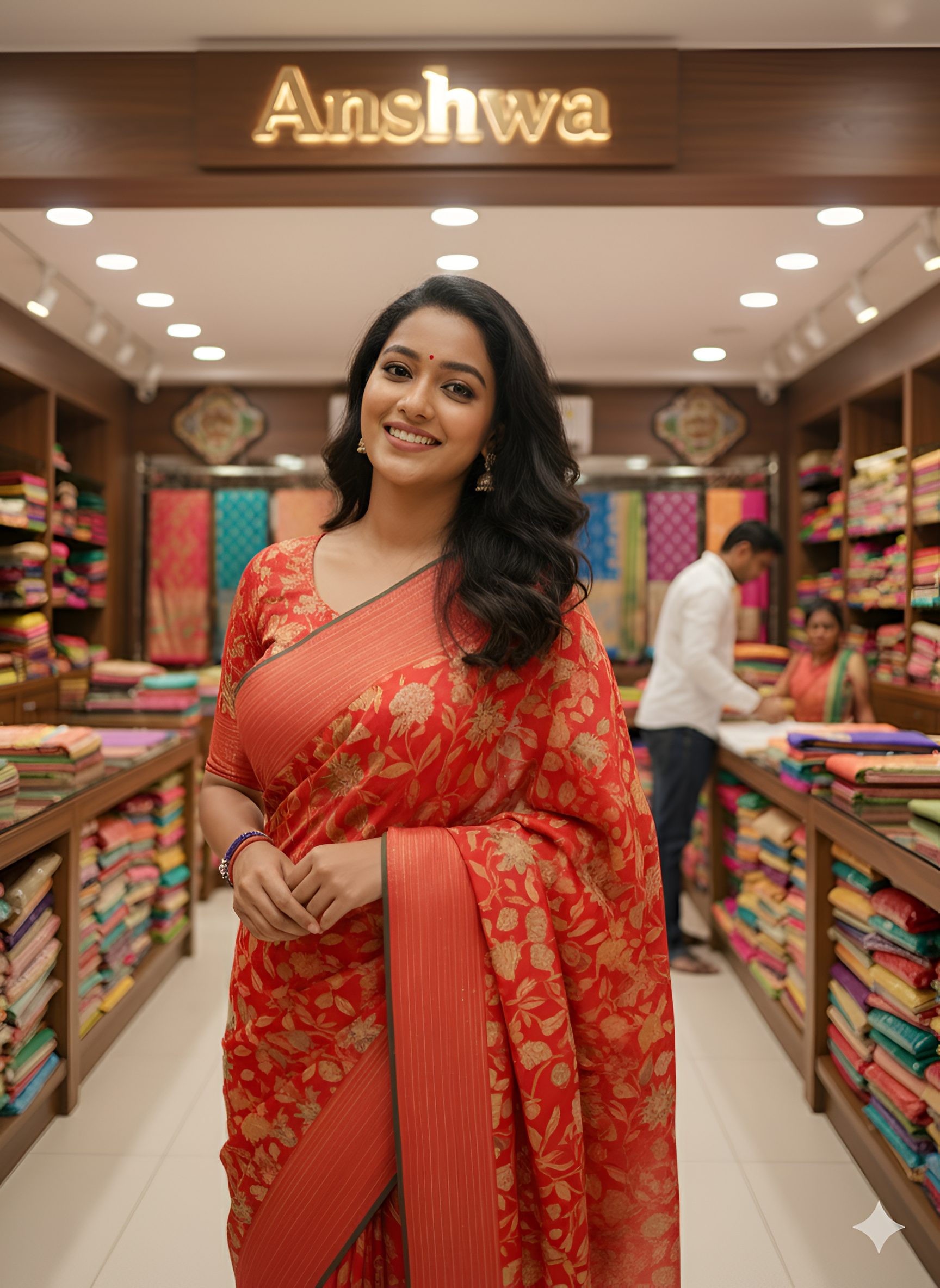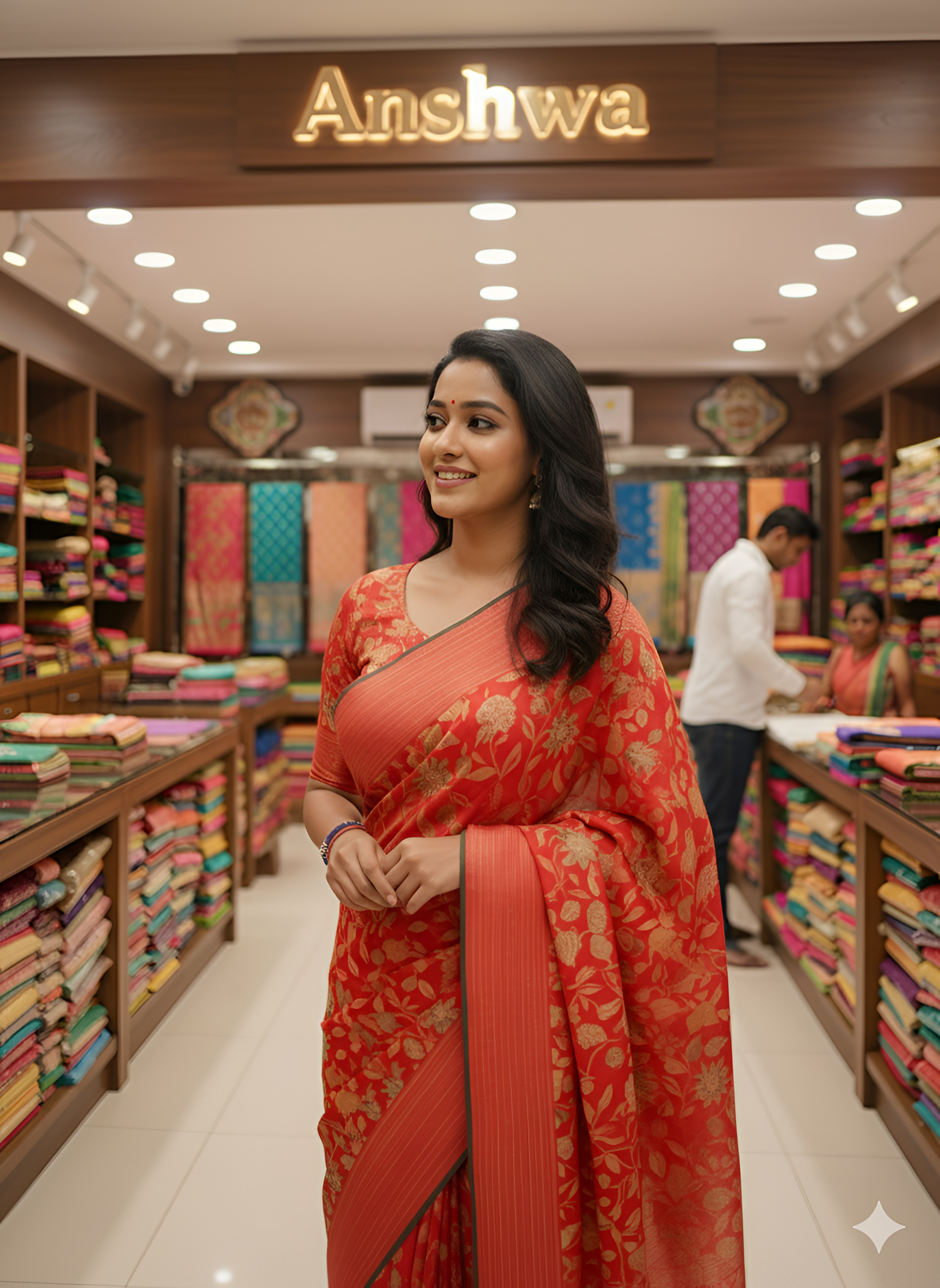 This stunning red saree features exquisite floral patterns woven with golden threads, offering a perfect blend of tradition and elegance. Made from high-quality silk, it provides a luxurious feel and a graceful drape. The saree comes with a matching blouse piece, making it a complete ensemble for special occasions like weddings, festivals, and cultural events. Its vibrant color and detailed craftsmanship make it a standout choice for those seeking timeless beauty.