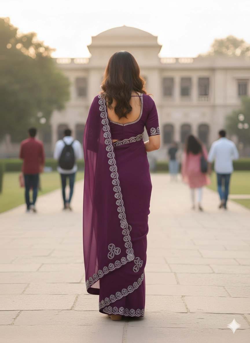 This royal plum purple chiffon saree showcases exquisite silver gota-patti embroidery with traditional paisley & floral motifs, beautifully captured against heritage architecture. The rich deep purple shade with shimmering silver border creates sophisticated elegance.