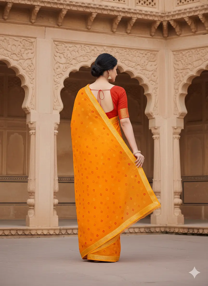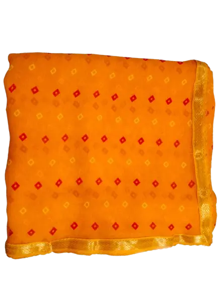 This radiant saffron Bandhani saree captures the vibrant spirit of traditional Indian artistry, handcrafted from lightweight and breathable fabric that drapes effortlessly for all-day comfort. Featuring a classic tie-dye Bandhani pattern with intricate diamond motifs in contrasting red and orange tones, it exudes a warm, festive energy perfect for celebrations like Diwali, weddings, or cultural gatherings. The golden border adds a luxurious sheen, enhancing its elegant appeal. Paired with a matching red blouse with subtle embroidery, this saree blends timeless heritage with modern sophistication, allowing you to shine with graceful poise.