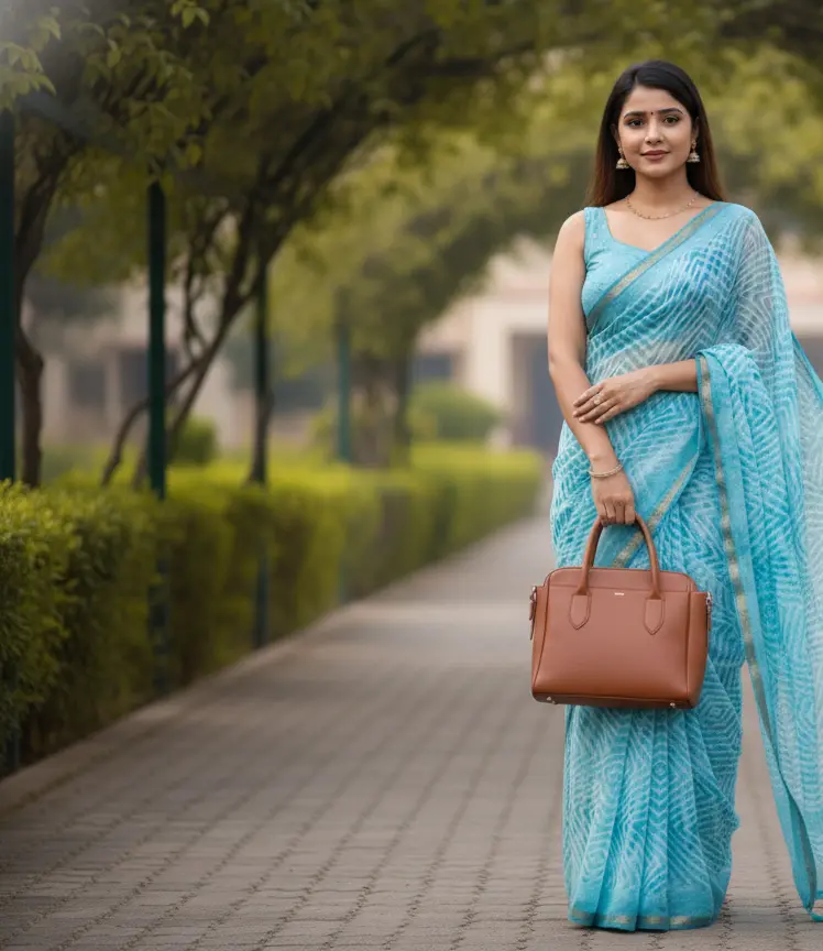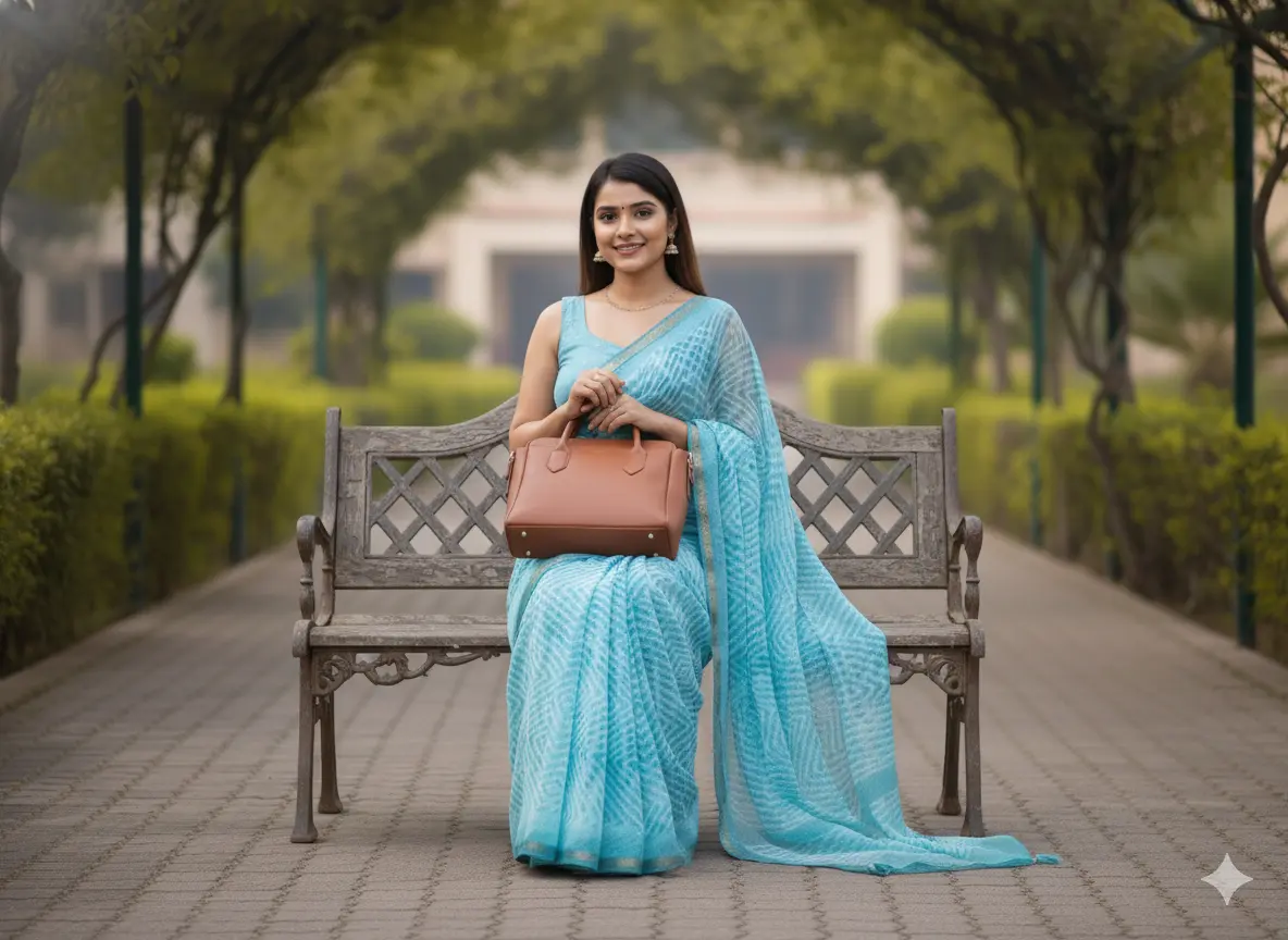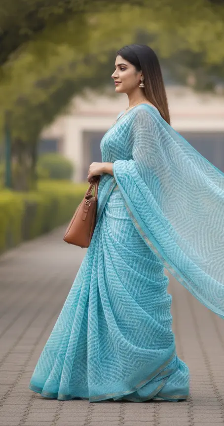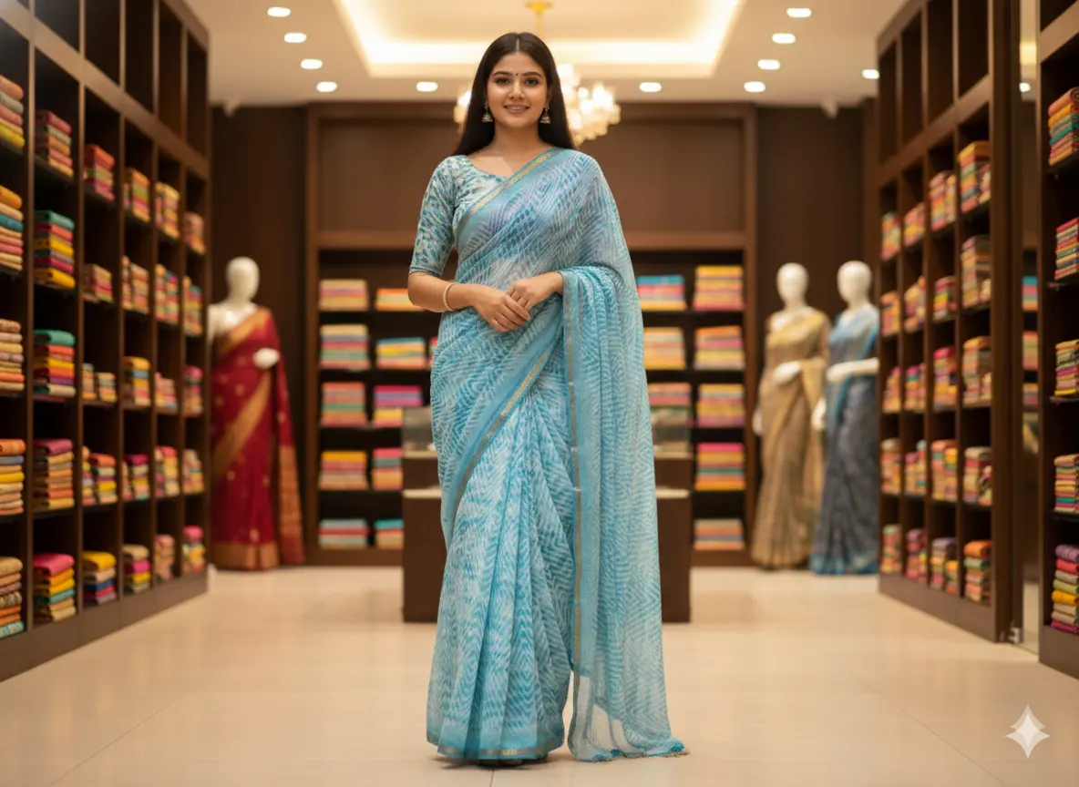 Stunning blue georgette saree with abstract white print and golden zari border. Paired with matching sleeveless blouse featuring subtle shimmer.