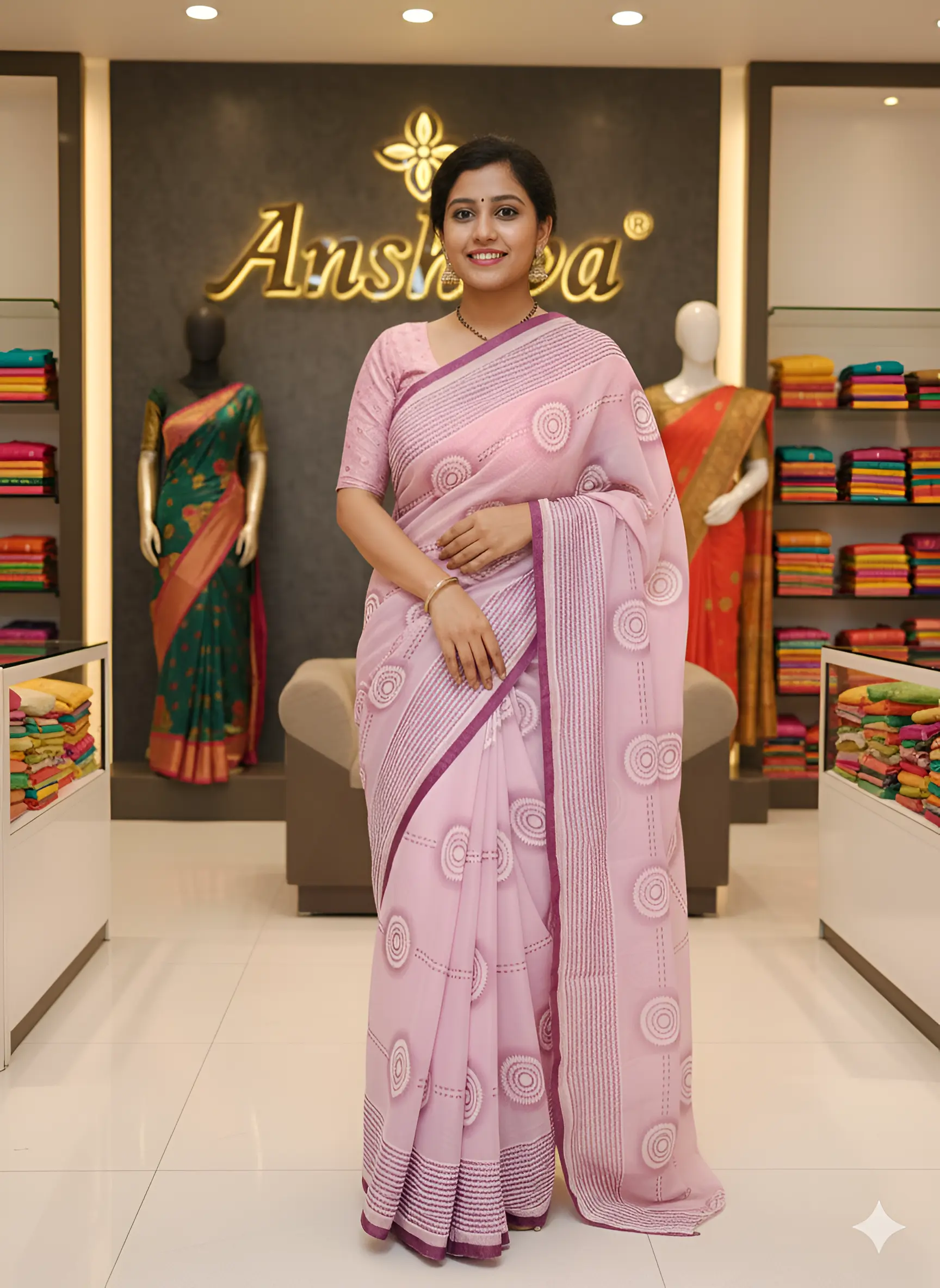 A charming soft pink saree with elegant circular motifs and a contrasting border, crafted from lightweight fabric for a graceful drape.