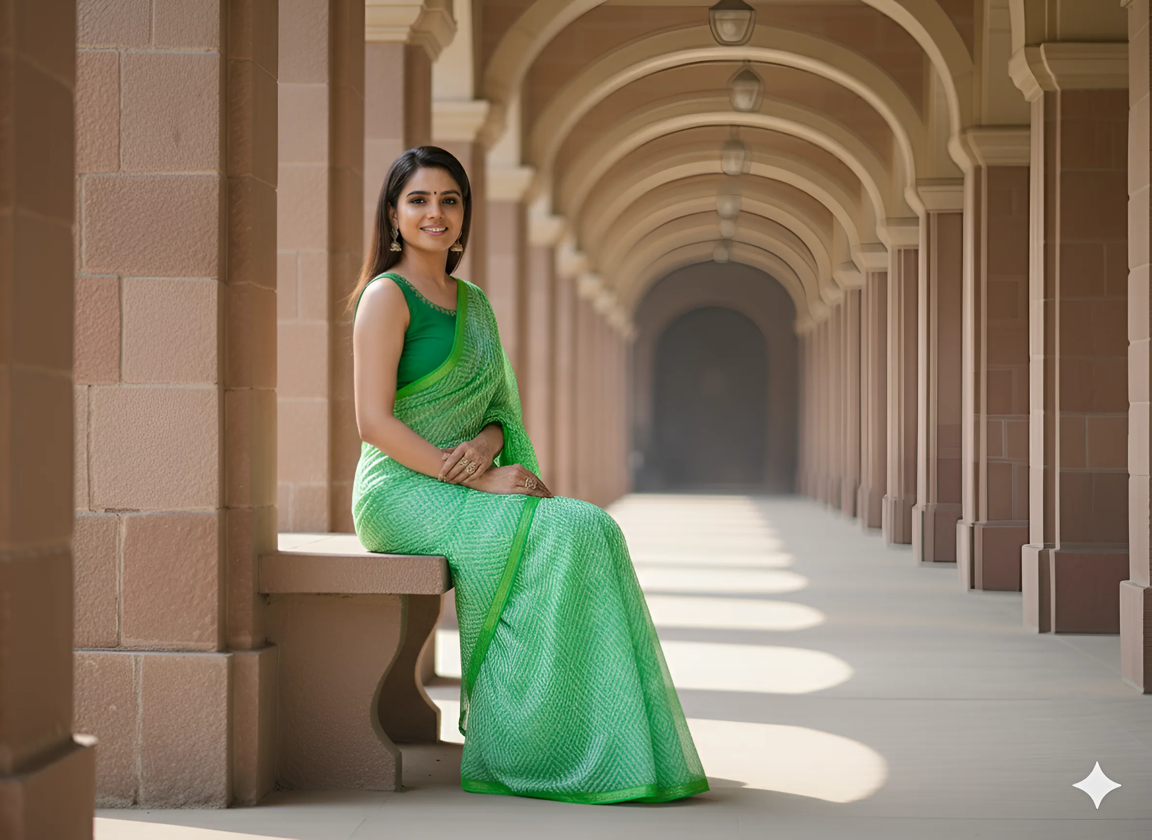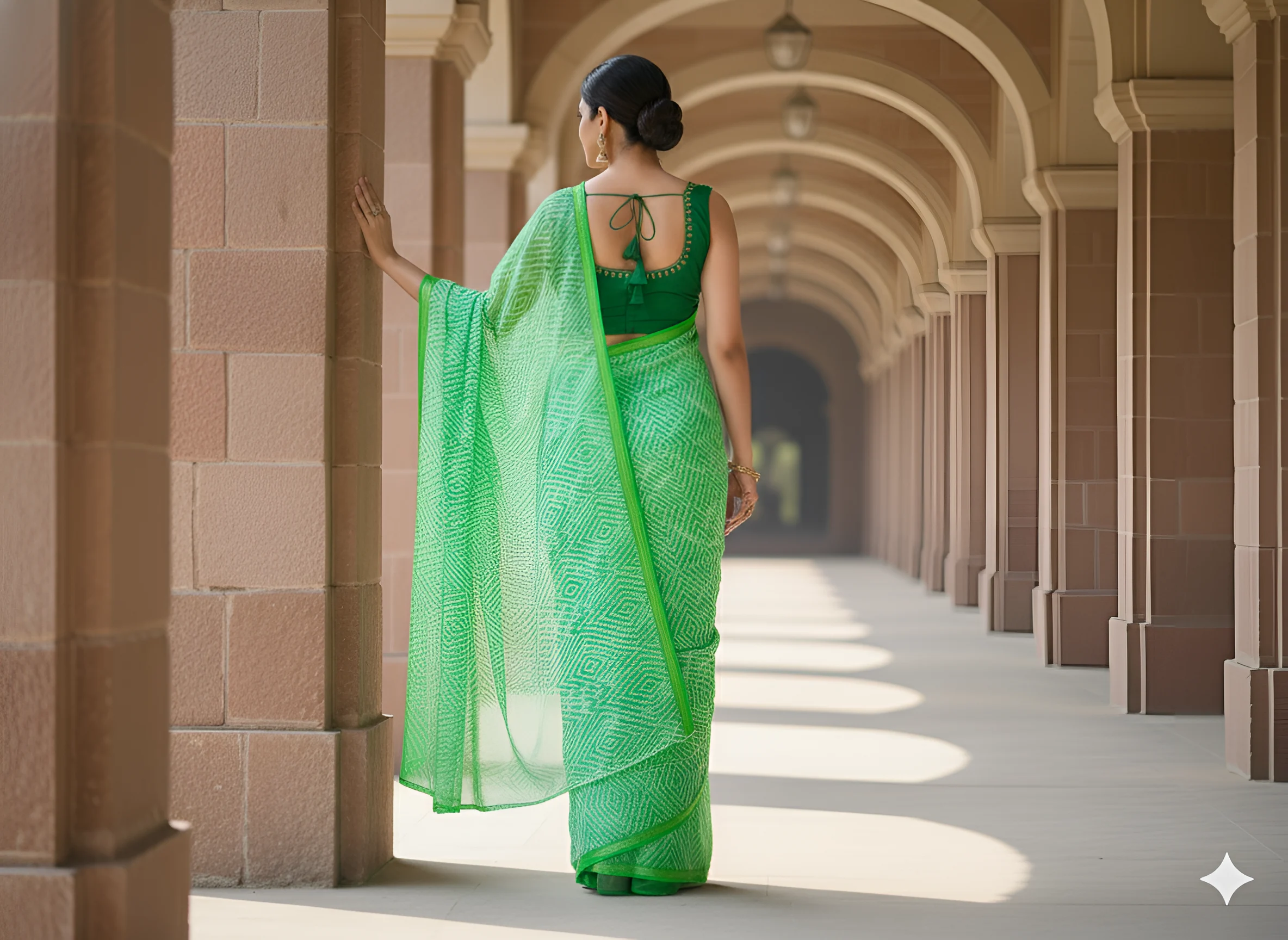 This vibrant green Bandhani chiffon saree exudes Rajasthani royalty, beautifully captured against heritage stone architecture. The intricate Bandhani geometric pattern in sheer chiffon creates a mesmerizing flow and lightweight elegance.